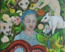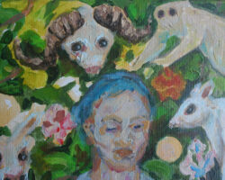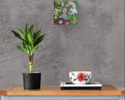This small little painting features textured acrylic paint and a loosely painted person surrounded by animals within a leafy setting. I am an animal and nature-lover and this, along with other paintings, reflects feeling at one with and part of the natural world.