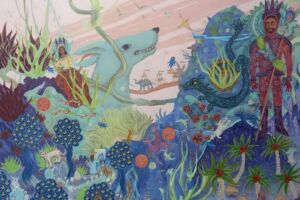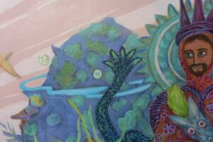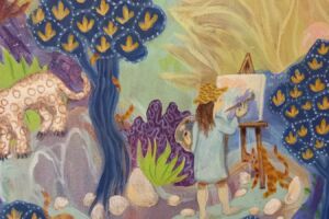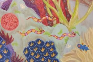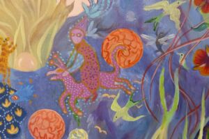 And while not Baroque in style, the maximalism approach of having numerous subjects and decorative elements, colours, shapes and forms within one painting is Baroque-like. All my work features animals, plants and nature (even non-existent creatures and plants find their place into my art). These natural elements reflect my love and appreciation of the natural world around me, my care for the environment and my practice of observing all the tiny intricate details I look out for when out in nature – each ‘cog’ no matter how small interdependent on each other.