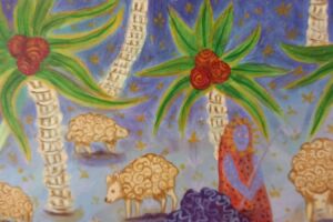 Original painting, painted in 2024 with acrylic on canvas in multiple layers. This is a medium-large painting (1m on the widest side). It is part of a recent series of paintings where my work is moving towards a more illustrative style inspired by Medieval illuminated manuscripts, by Persian Miniatures and by historical and mythological imagery and archaeological items. Patterns are in evidence here and there, a nod to traditional Middle-Eastern art and architecture and my own distant genetic heritage.