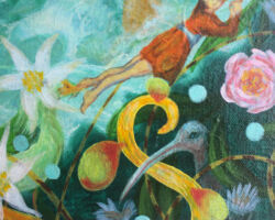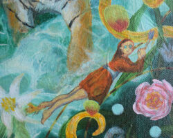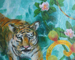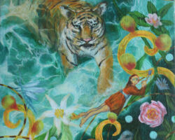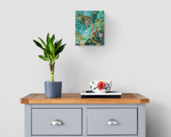 This painting started life as an abstract pattern. I then decided to paint over it with the churning green sea as a semi-abstract ‘seascape’. Its latest incarnation is includes a tiger, strange plants, flowers and a small flying figure as part of my strange gatherings series of paintings with (sometimes) surreal themes, tangled nature and animals. You can see the history of this painting in the raised paint layers when seen in detail.